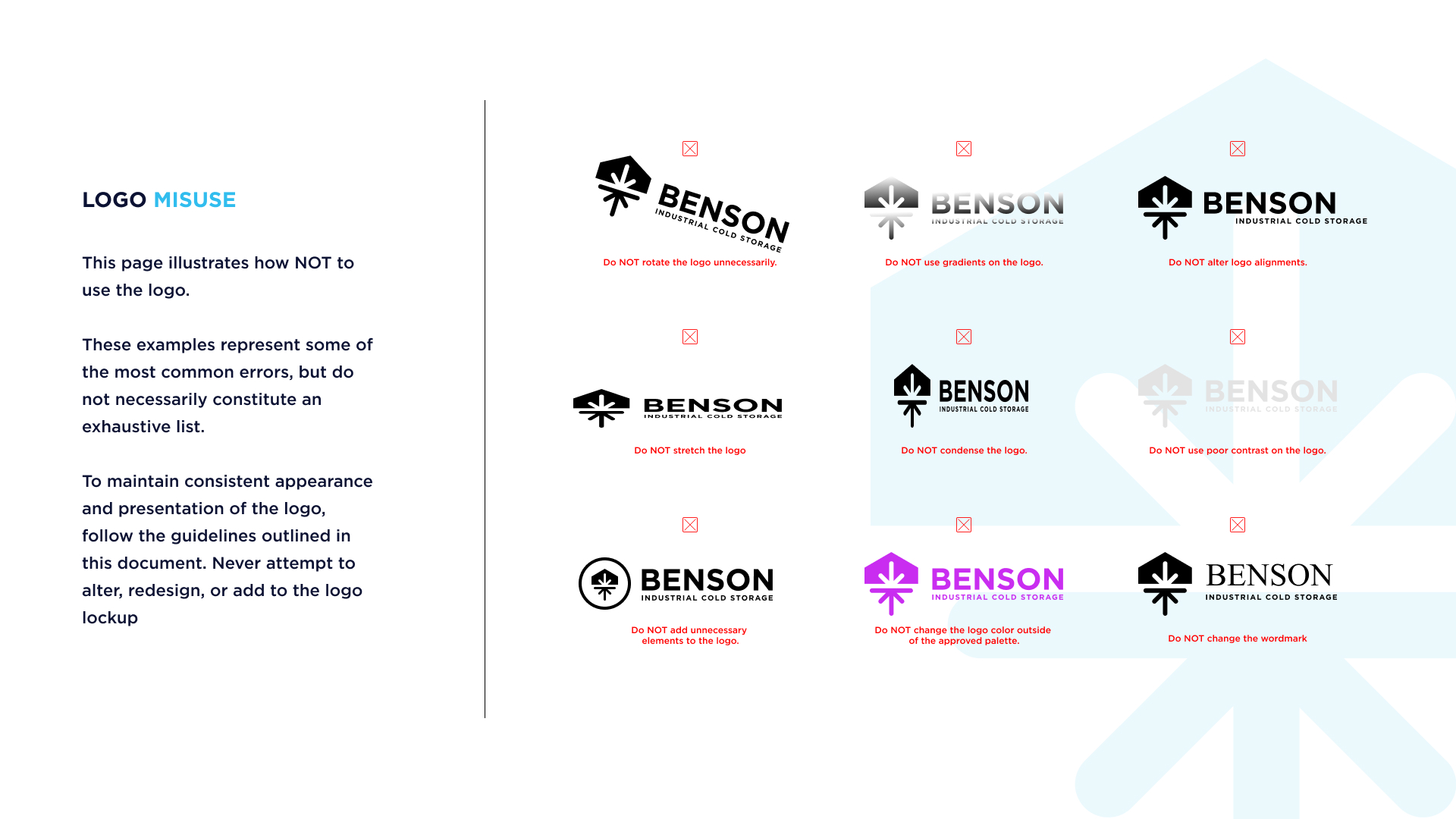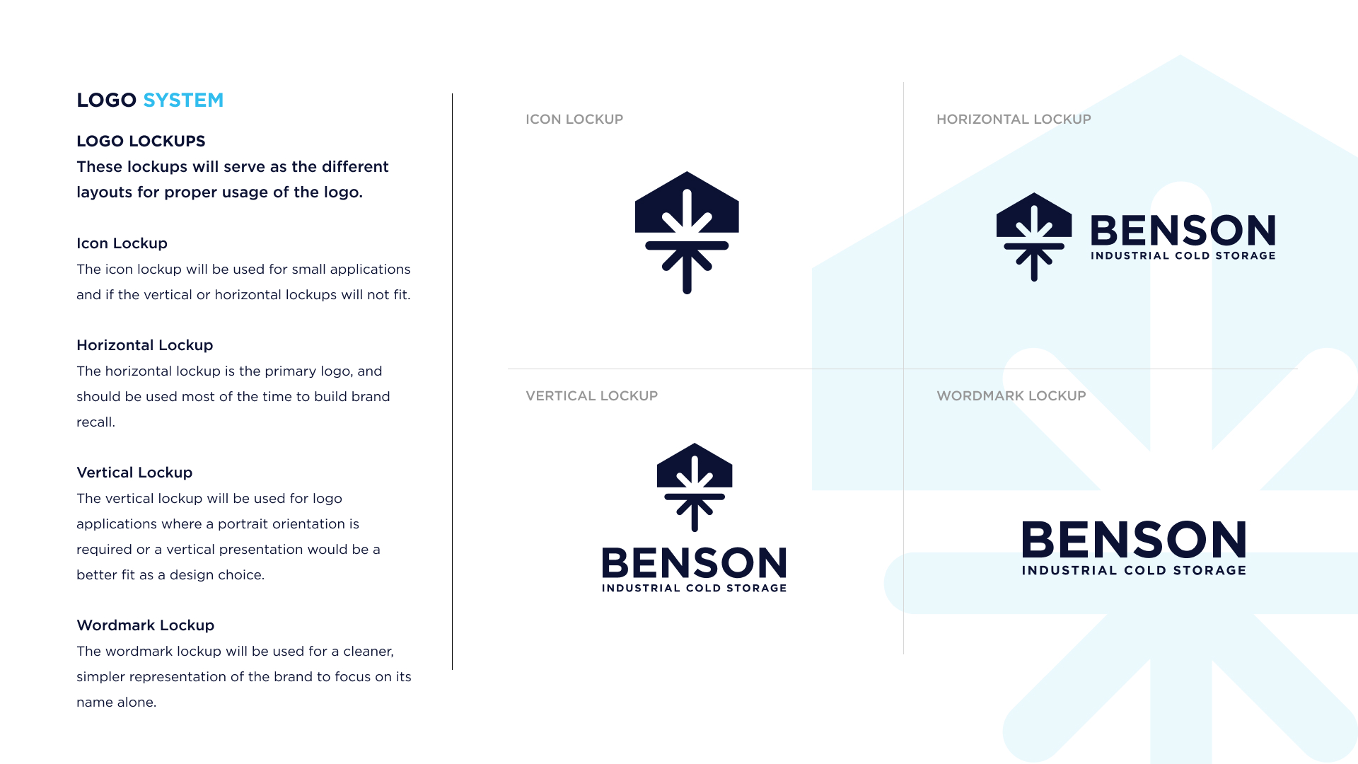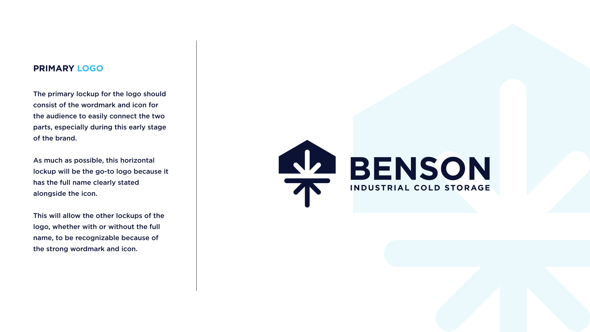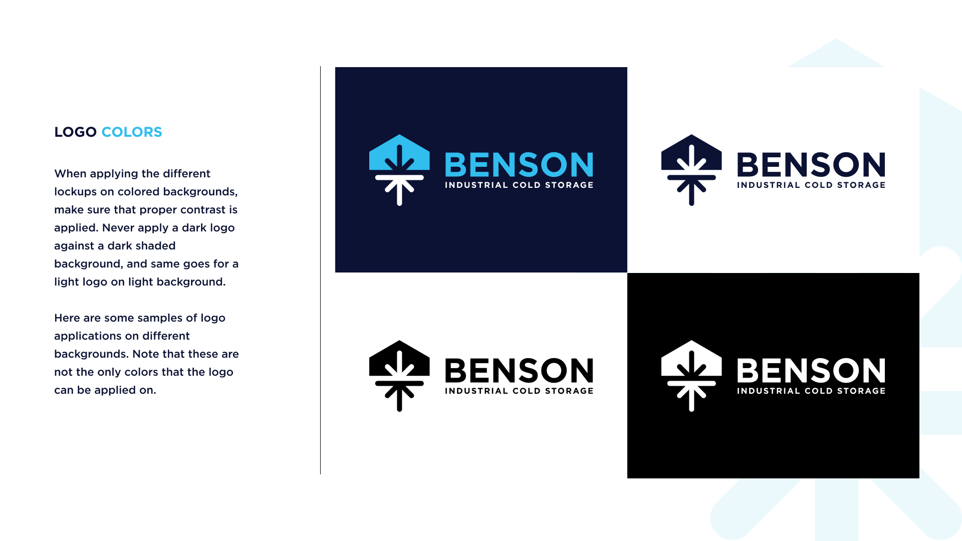 Benson Industrial Cold Storage wanted a strong and recognizable brand identity that would reflect their industry while keeping their name at the forefront. The branding project focused on creating a logo and visual system that communicates both their reliability and the cold storage services they provide.